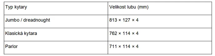 U běžných typů kytary se setkáme s těmito velikostmi lubů: